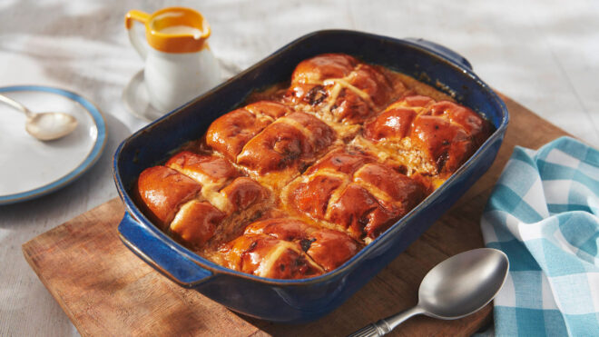 Hot cross bun pudding is a delicious way to use up any leftover buns, or a lovely way to finish your Easter meal.
